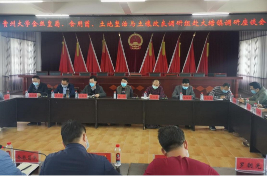 2020年4月15日,农学院党委书记杨刚、副院长程剑平,新农村发展研究院副院长何腾兵、张明生、吴文旋,生命科学学院,机械工程学院,酿酒与食品工程学院和生化工程中心相关专家等一行17人赴平塘县大塘镇开展金丝皇菊、食用菌、土地整治与土壤改良等方面的调研。平塘县农业农村局党组书记、局长李德禹,大塘镇党委书记令狐昌洪、副镇长罗世军、在大塘镇挂职的贵州大学资源与环境工程学院党委副书记徐进、贵州大学机械工程学院教师田森以及相关部门负责人参加调研和座谈会。座谈会由大塘镇党委书记令狐昌洪主持。