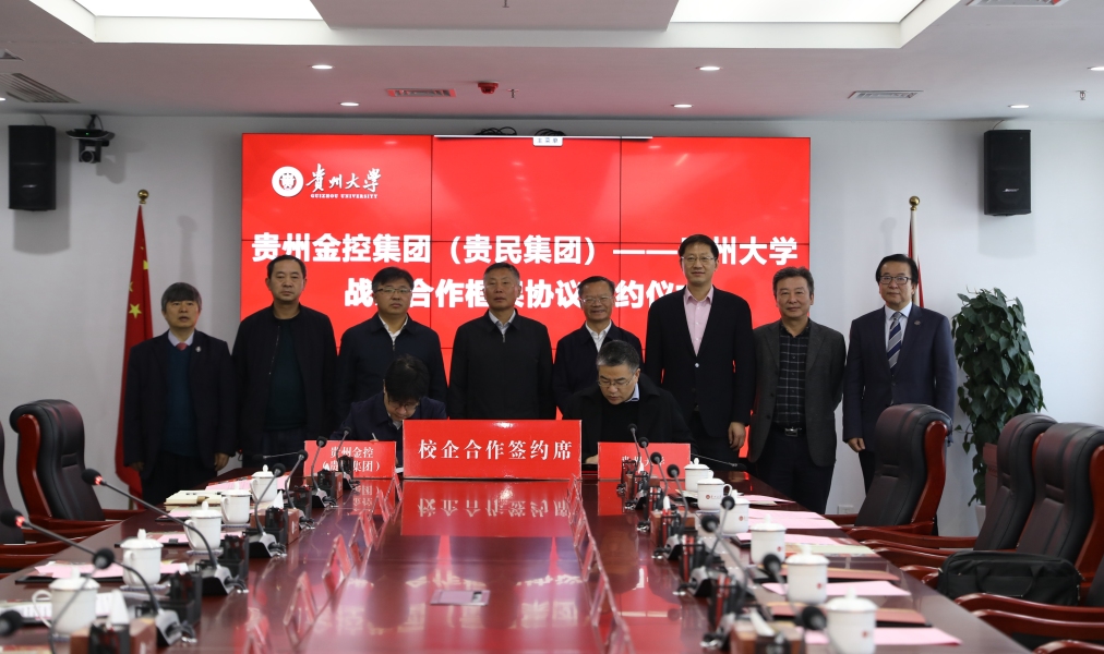 仪式上,陈景德与我校副校长杨松共同签署了《贵州金控集团(贵民集团)——贵州大学战略合作框架协议》,袁周、胡忠雄、邹康、邹联克、谭勇、李桂春、李建军、校长宋宝安院士及现场与会人员共同见证了签约。