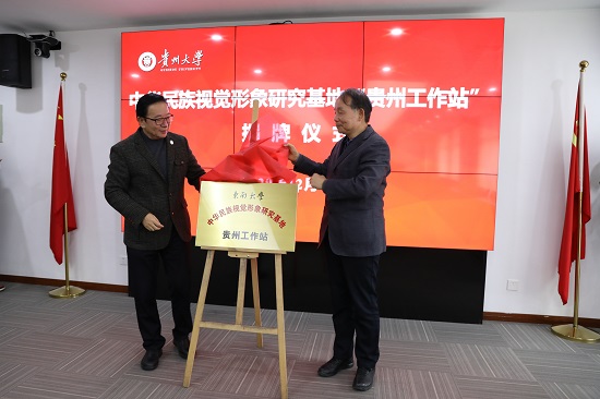 会议中,由王建国、王曼、李建军共同为“中华民族视觉形象研究基地•贵州工作站”揭牌。