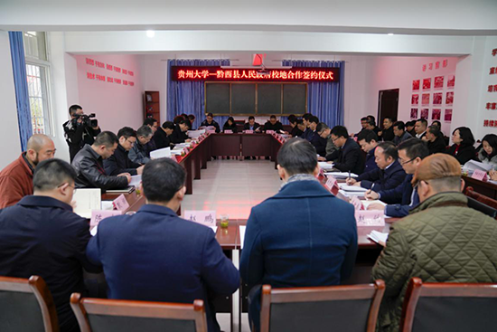 为贯彻落实习近平总书记春节前视察贵州重要讲话精神,3月9日上午,校领导李建军、骆长江、杨松、张大林和学校党委办公室、校长办公室、对外合作处、后勤管理处、资源与环境工程学院、美术学院、旅游与文化产业学院、农学院、动物科学学院、建筑与城市规划学院负责人赴毕节市黔西县新仁乡化屋村,调研当地经果林发展、生态保护以及农村产业发展情况,并在村办公楼会议室召开座谈会,签定《校地战略合作框架协议》,就黔西县新型工业化、新型城镇化、农业现代化、旅游产业化等方面的需求开展合作洽谈。