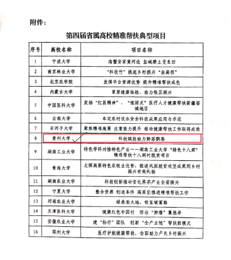 10月11日,教育部公布了第四届省属高校精准帮扶典型项目推选结果。由我校对外合作处、基层社会治理高端智库和精细化工研究开发中心共同完成的《科技赋能助力黔茶飘香》典型项目成功入选。至此,贵州大学连续3年获得教育部省属高校精准帮扶典型项目。