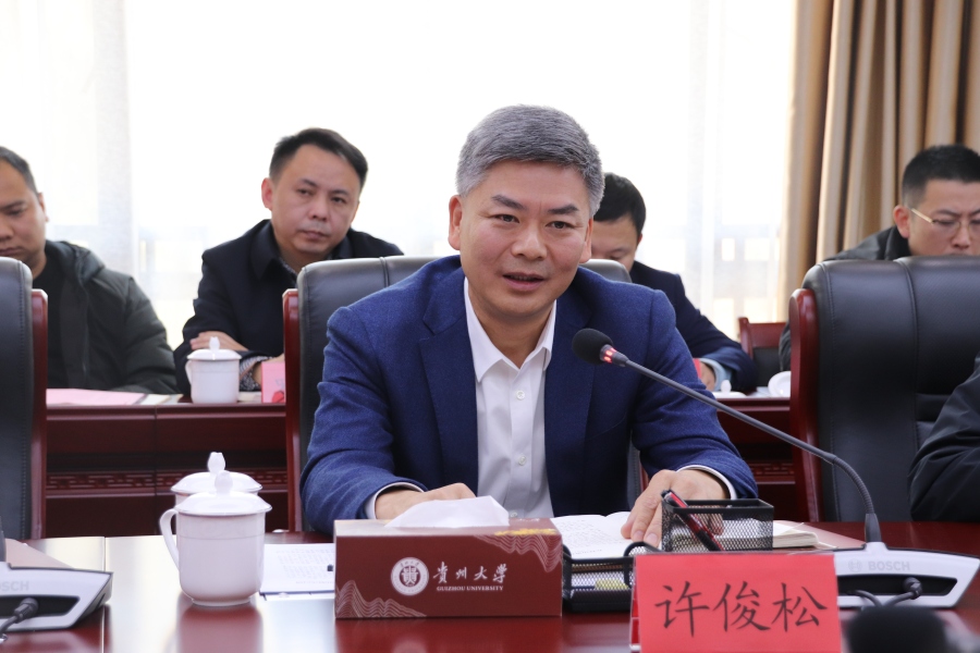 许俊松讲话。他表示,近年来,花溪区的发展离不开贵州大学的支持,此次来访贵州大学,目的为表感谢之意、话校地之谊、启合作之篇、尽服务之责,希望贵州大学继续将更多的科研成果、创新理念及优秀人才带到花溪,深化校地合作,助推花溪及贵州高质量发展。他强调,花溪区各级各部门将高标准、高质量、严要求持续做好服务保障工作,助推贵州大学“双一流”建设工作。