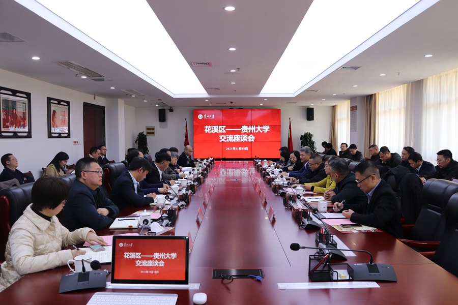 11月18日上午,花溪区委书记许俊松,区委副书记、区政府区长俞洋,区人大常委会主任秦建军,区政协主席禄竹,区委副书记刘承佳,区委常委、区委政法委书记蒙朝阳一行来校交流,座谈会在贤正楼1号楼311会议室召开。校党委书记李建军,校长宋宝安院士,校党委副书记骆长江、令狐彩桃,校党委常委、纪委书记、监察专员唐本文,副校长张大林、吴攀出席会议,校党委常委、组织部部长李昕昌、宣传部部长杨楠、统战部部长卓永,我校相关部门负责人及花溪区相关部门、街道负责人参加会议。会议由骆长江主持。