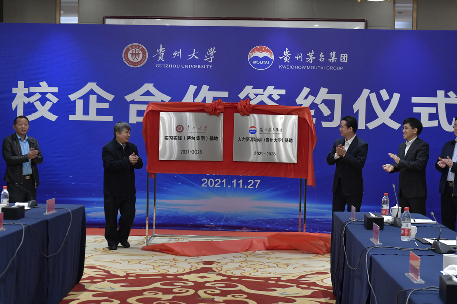 签约仪式上,丁雄军与宋宝安共同为贵州大学实习实践(茅台集团)基地和茅台集团人力资源培训(贵州大学)基地揭牌。