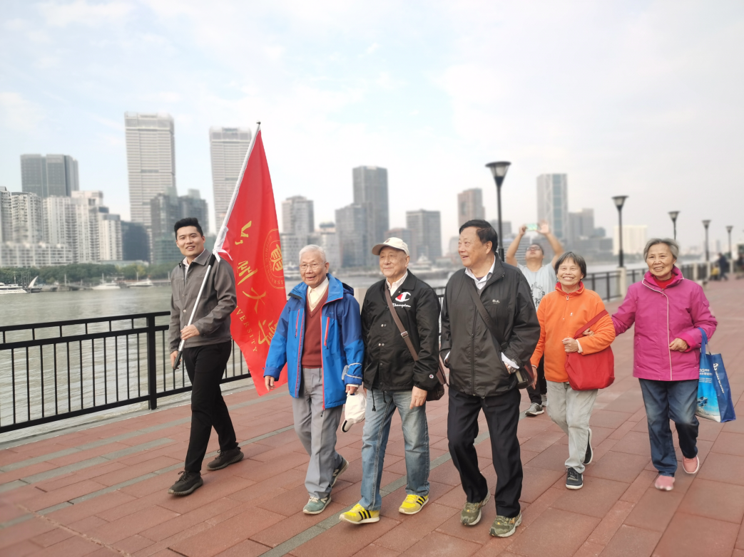 吴元方常务副会长高举校旗,由浦东一号望江驿出发,校友们跟随校旗,阔步向前。在四号望江驿,81岁高龄的陈世杰会长带领七位平均年龄超八十岁的老校友乐霞君,郭爱莲,吴美丽,宋启根,熊可君,田官吉、曾永信与大部队顺利会师后,老中青校友携手并肩,一路欢声笑语,整个活动过程校友们热情高涨。
