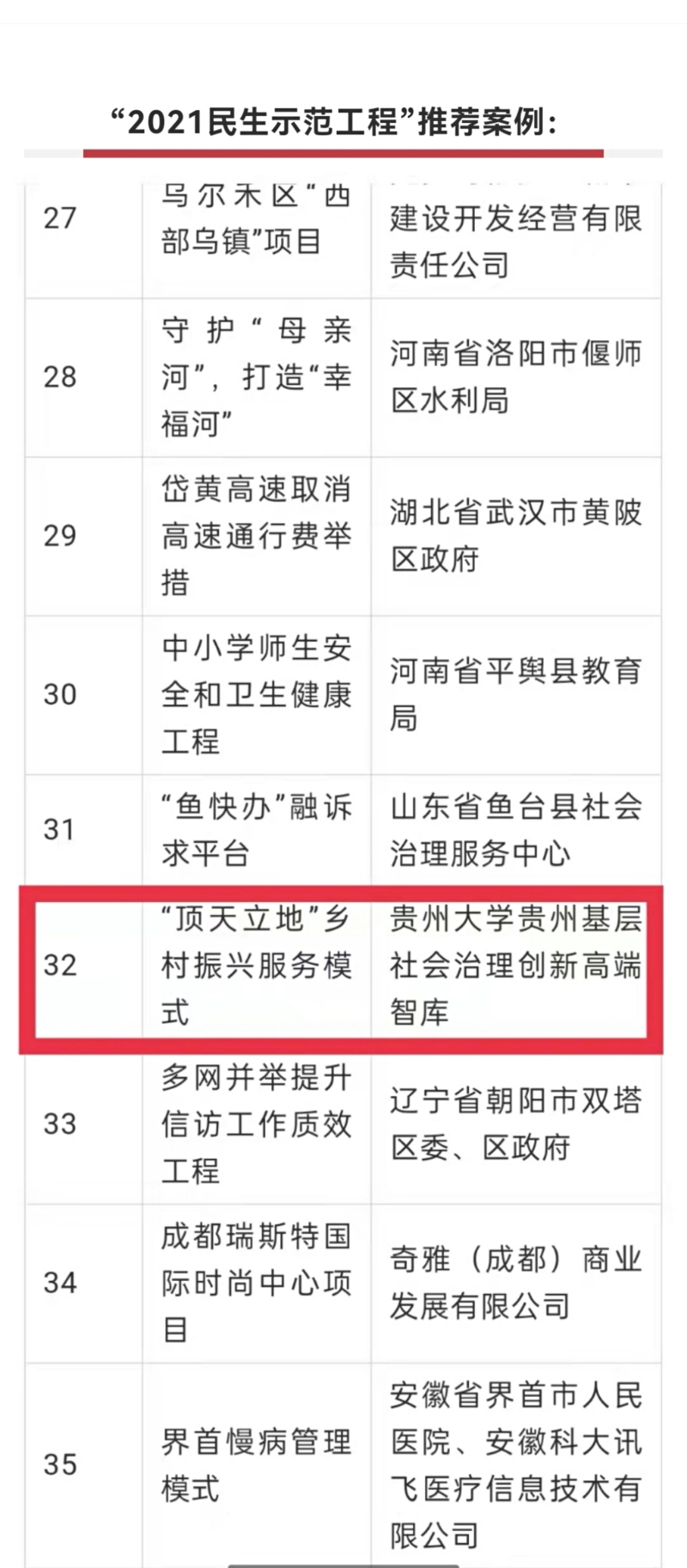 在12月18日召开的第九届中国民生发展论坛中,组委会正式发布由《民生周刊》根据一年来调研采访推出的“我为群众办实事——2021民生示范工程”推荐案例。我校贵州基层社会治理创新高端智库实施的项目“顶天立地”乡村振兴服务模式获得推荐。
