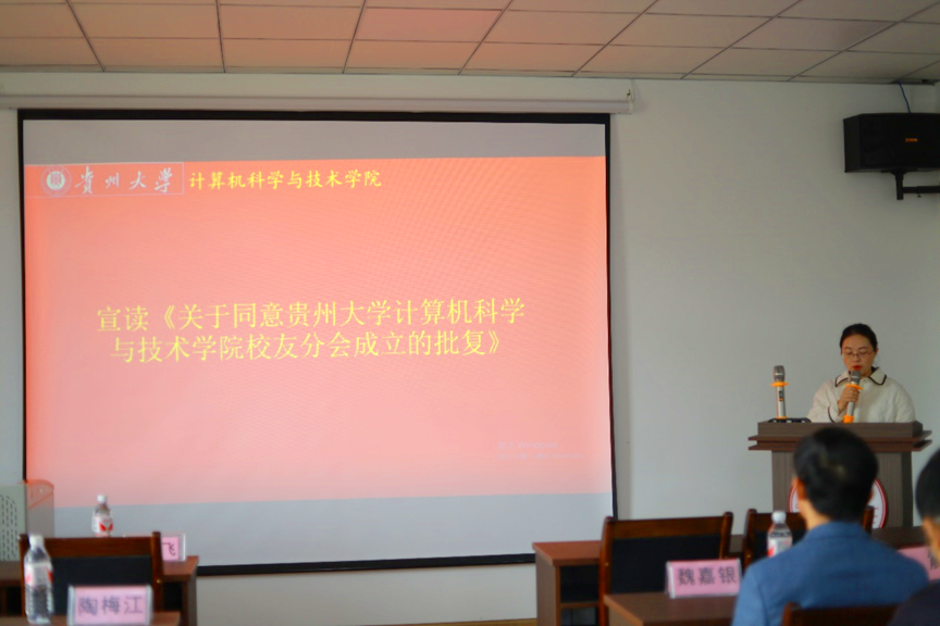 陶梅江宣读《关于同意贵州大学计算机科学与技术学院校友分会成立的批复》。