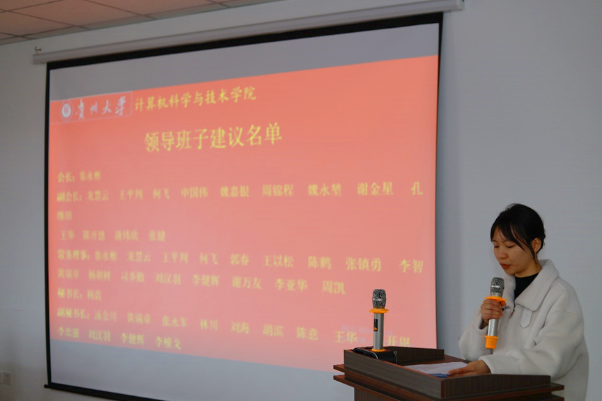 大会审议并通过贵州大学计算机科学与技术学院校友分会第一届理事会名单及《贵州大学计算机科学与技术学院校友分会章程》。