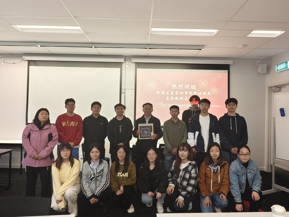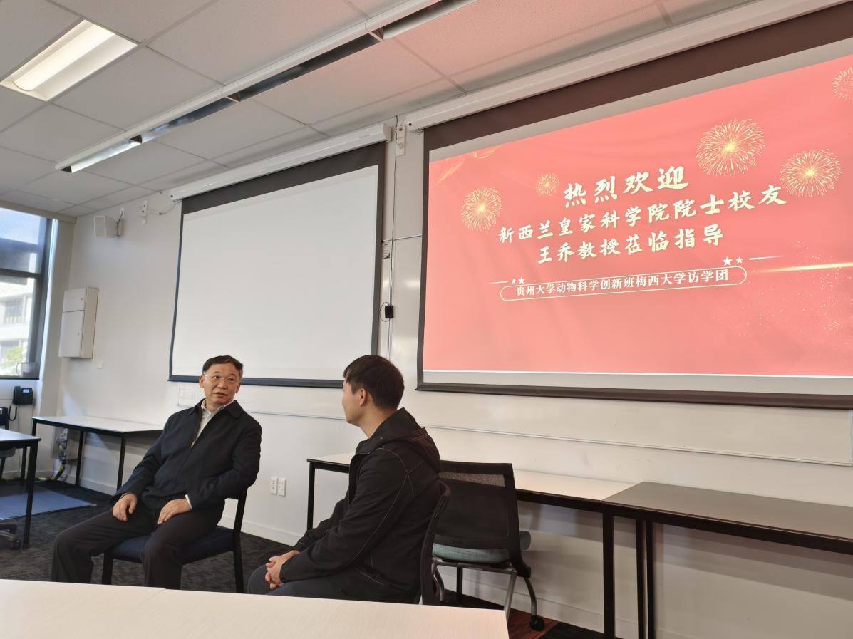 2025年4月10日下午,我校1977级植物保护专业杰出校友、新西兰皇家科学院院士王乔教授受邀莅临新西兰梅西大学,看望由贵州大学教育发展基金会“大北农发展基金”支持项目“大北农创新班”——“贵州大学动物科学学院赴新西兰梅西大学国际短期课程项目”访学团师生,并开展座谈交流。会议由带队教师王惟惟主持,动物科学学院2021级动科创新班16名同学参加交流会。